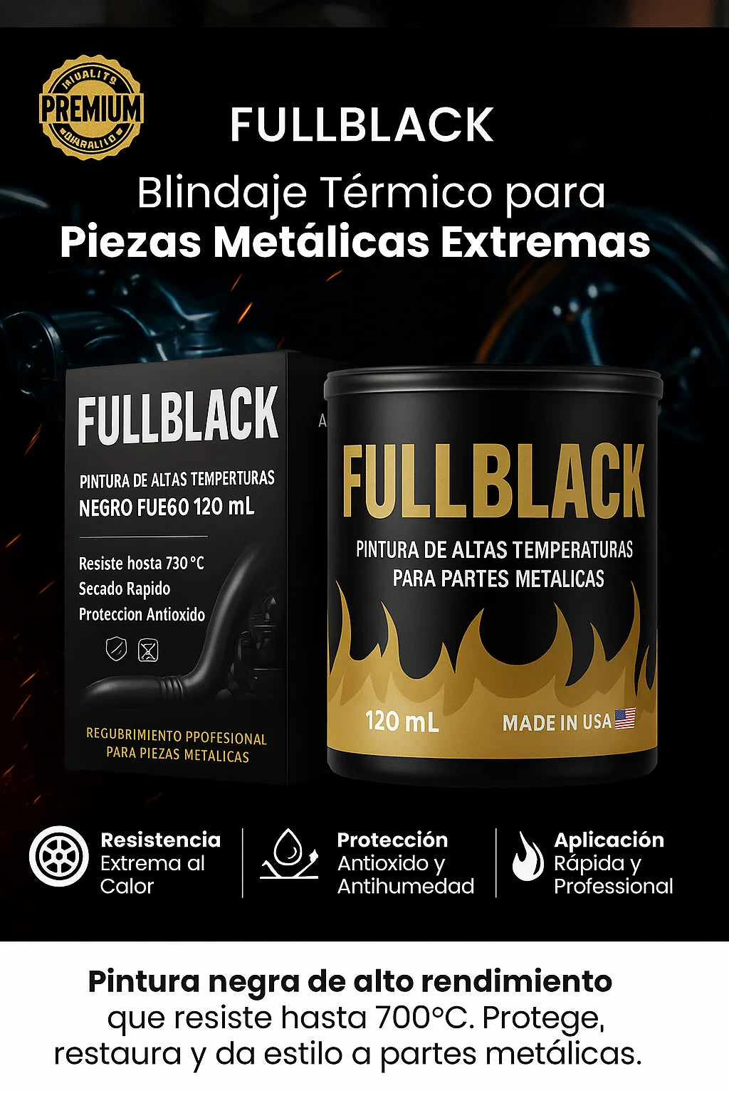 Con FullBlack™, dale nueva vida a tus piezas metálicas, está diseñada para ofrecer una protección duradera contra el calor extremo, la corrosión y la humedad. Su fácil aplicación y acabado profesional no solo restauran, sino que también proporcionan una protección superior para motores, escapes y otras partes metálicas expuestas a condiciones severas.